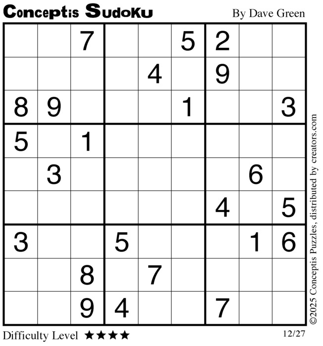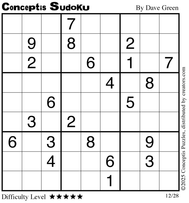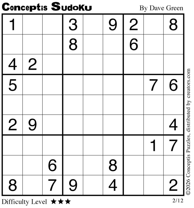 Each puzzle consists of a 9x9 grid containing given clues in various places. The object is to fill all empty squares so that the numbers 1 to 9 appear exactly once in each row, column and 3x3 box.